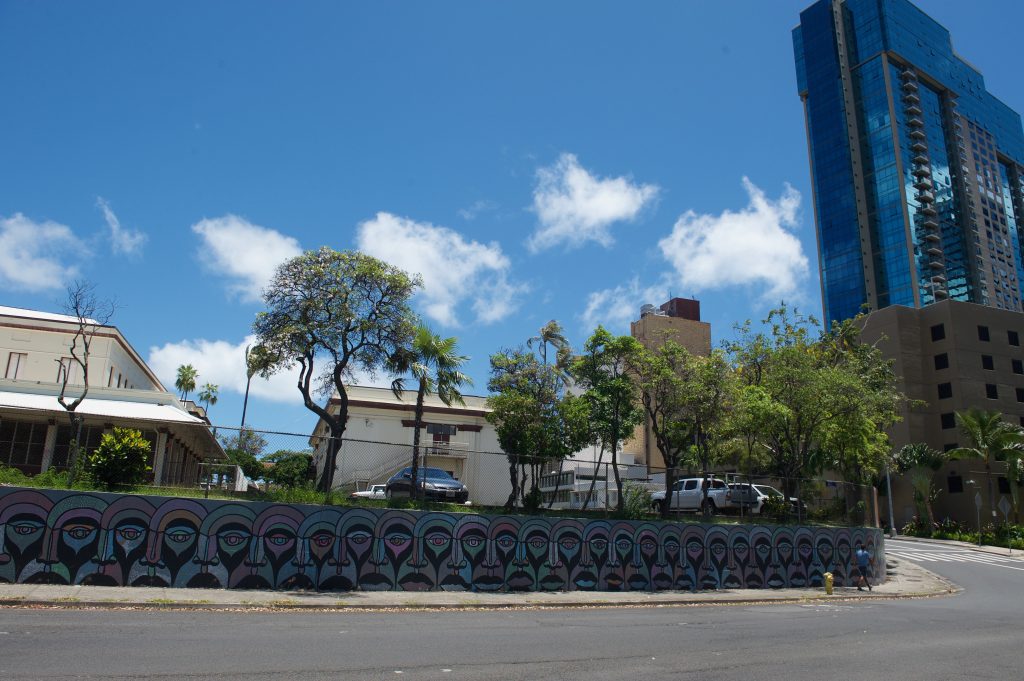 The mural is situated on a highly visible public wall that fronts the school. The bold design is clearly visible to passers-by on the busy Pali Highway. The location of the mural allowed students to connect with the communities surrounding their school, as many pedestrians stopped to admire and ask questions during the sunny Saturday in May 2017 when the mural’s creation was underway.