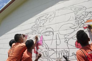 Solomon began the mural by sketching outlines of the faces in black. Then the children of Honolulu Central Middle School applied colourful stippling using acrylic paint pens. Invited members of their families, school staff, and community volunteers joined in.