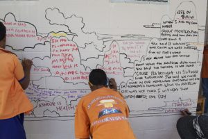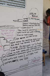 The second Ejit mural covered several walls of the school’s ablution block. The outlines of the mushroom cloud drawn by Solomon left space for the children to write and add colour. Some children wrote personal testimonies on the mural, including accounts of the nuclear era and ways of life passed down to them from their parents and grandparents. Others wrote reflections on their experience of working with Solomon and the MAP team.