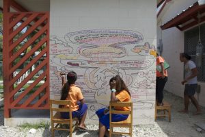 The second mural at the Cooperative School includes images and symbols that recurred in the poetry written by the children in workshops run by Kathy Jetnil-Kijiner. Solomon prepared basic designs in outline and invited the children to embellish them. Some of them inscribed excerpts from their poems in and around the outlines, while others wrote new pieces reflecting on their relationships with the environment and Marshallese culture.