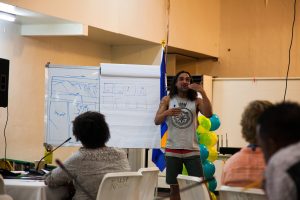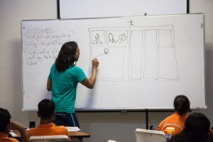 Michelle Keown and Shari Sabeti joined Solomon in introducing RMI elementary school teachers to methods for teaching comics and graphic novels, and engaging students creatively and intellectually with comic-making workshops. This involved the teachers testing out the workshop by drawing their own comics.